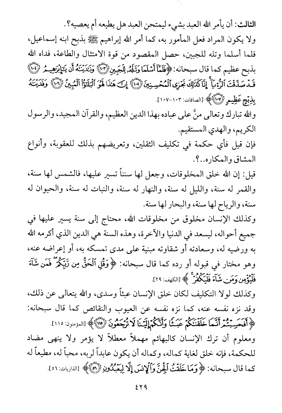 وكذلك لولا التكليف لكان خلق الإنسان عبثاً وسدى، والله يتعالى عن ذلك، وقد نزه نفسه عنه، كما نزه نفسه عن العيوب والنقائص كما قال سبحانه: {أَفَحَسِبْتُمْ أَنَّمَا خَلَقْنَاكُمْ عَبَثًا وَأَنَّكُمْ إِلَيْنَا لَا تُرْجَعُونَ (115)} [المؤمنون: 115].