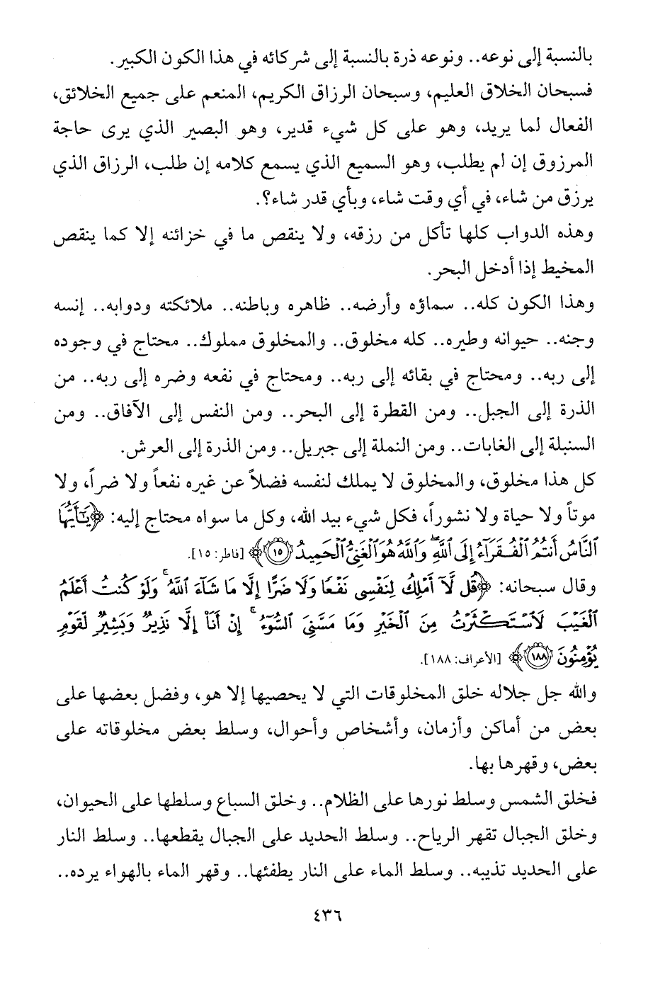 وهذا الكون كله .. سماؤه وأرضه .. ظاهره وباطنه .. ملائكته ودوابه .. إنسه وجنه .. حيوانه وطيره .. كله مخلوق .. والمخلوق مملوك .. محتاج في وجوده إلى ربه .. ومحتاج في بقائه إلى ربه .. ومحتاج في نفعه وضره إلى ربه .. من الذرة إلى الجبل .. ومن القطرة إلى البحر .. ومن النفس إلى الآفاق .. ومن السنبلة إلى الغابات .. ومن النملة إلى جبريل .. ومن الذرة إلى العرش.