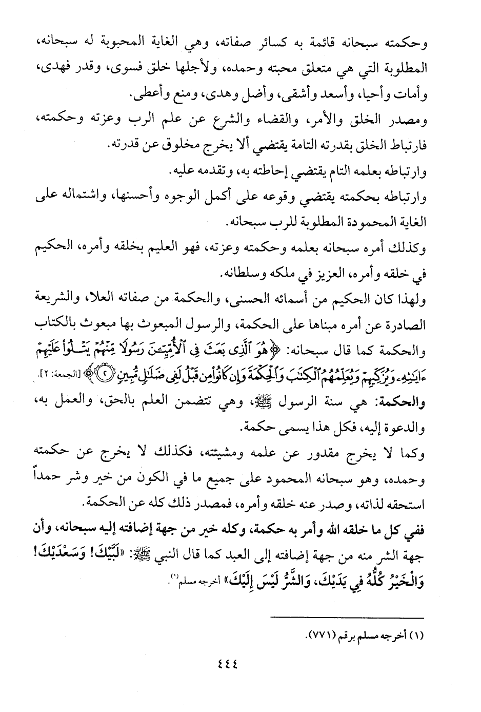 وارتباطه بحكمته يقتضي وقوعه على أكمل الوجوه وأحسنها، واشتماله على الغاية المحمودة المطلوبة للرب سبحانه.