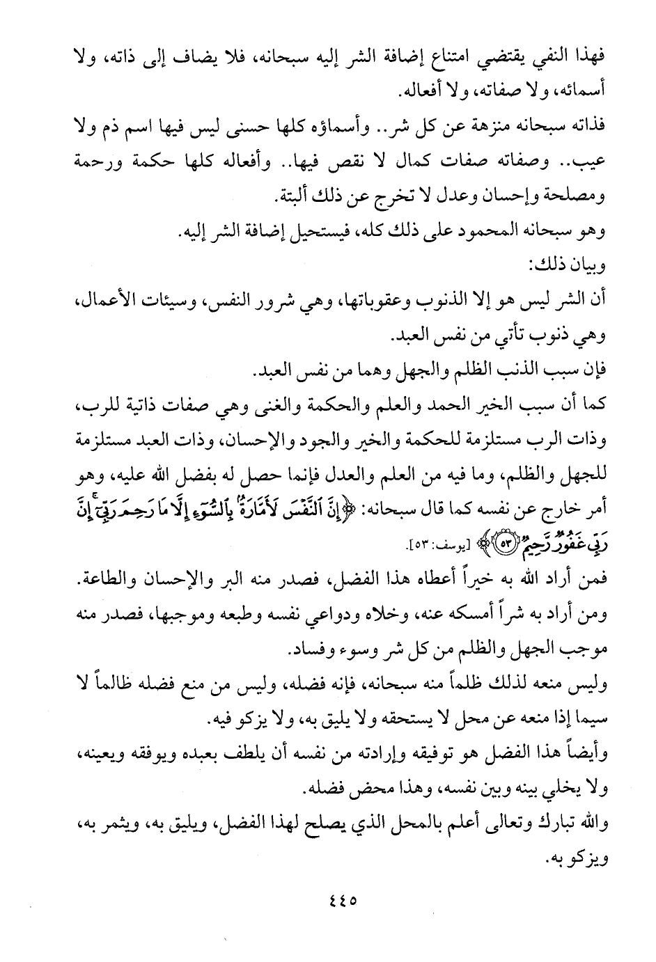 كما أن سبب الخير الحمد والعلم والحكمة والغنى وهي صفات ذاتية للرب، وذات الرب مستلزمة للحكمة والخير والجود والإحسان، وذات العبد مستلزمة للجهل والظلم، وما فيه من العلم والعدل فإنما حصل له بفضل الله عليه، وهو أمر خارج عن نفسه كما قال سبحانه: {إِنَّ النَّفْسَ لَأَمَّارَةٌ بِالسُّوءِ إِلَّا مَا رَحِمَ رَبِّي إِنَّ رَبِّي غَفُورٌ رَحِيمٌ (53)} [يوسف: 53].