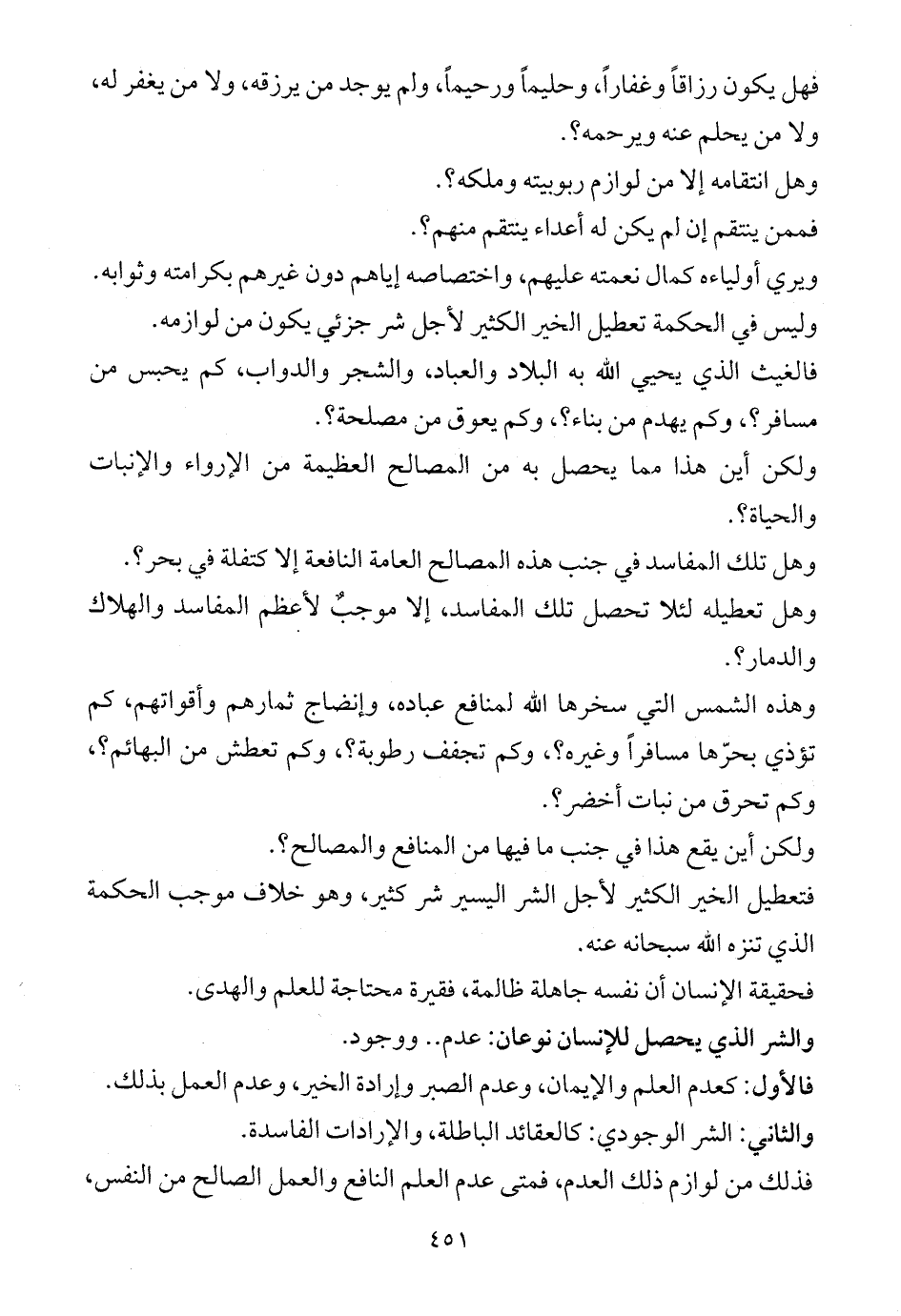 والثاني: الشر الوجودي: كالعقائد الباطلة، والإرادات الفاسدة.