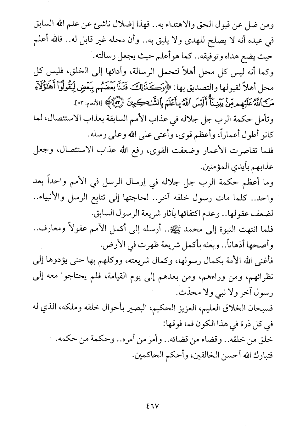 فلما انتهت النبوة إلى محمد - صلى الله عليه وسلم - .. أرسله إلى أكمل الأمم عقولاً ومعارف .. وأصحها أذهاناً .. وبعثه بأكمل شريعة ظهرت في الأرض.