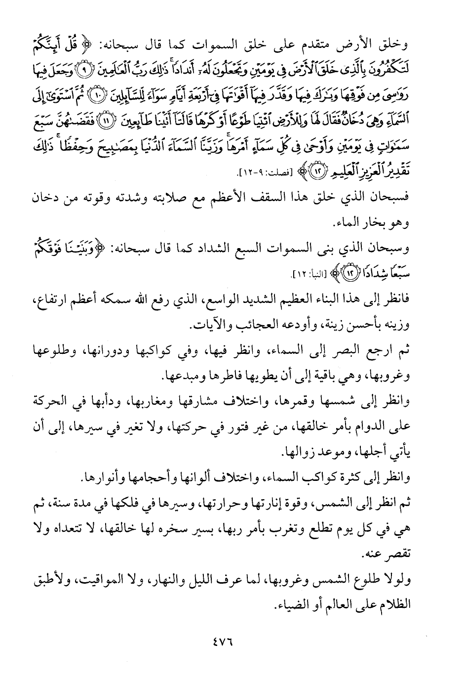 فانظر إلى هذا البناء العظيم الشديد الواسع، الذي رفع الله سمكه أعظم ارتفاع، وزينه بأحسن زينة، وأودعه العجائب والآيات.