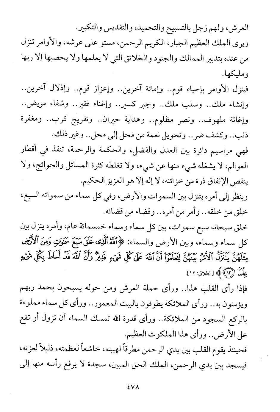 ويرى الملك العظيم الجبار، الكريم الرحمن، مستو على عرشه، والأوامر تنزل من عنده بتدبير الممالك والجنود والخلائق التي لا يعلمها ولا يحصيها إلا ربها ومليكها.