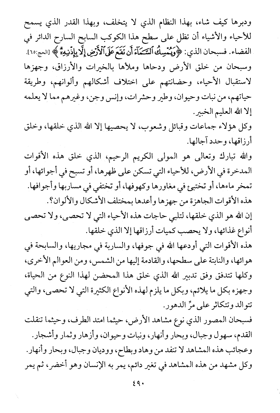 فسبحان المصور الذي نوع مشاهد الأرض، حيثما امتد الطرف، وحيثما تنقلت القدم، سهول وجبال، وبحار وأنهار، ونبات وحيوان، وأزهار وثمار وأشجار.