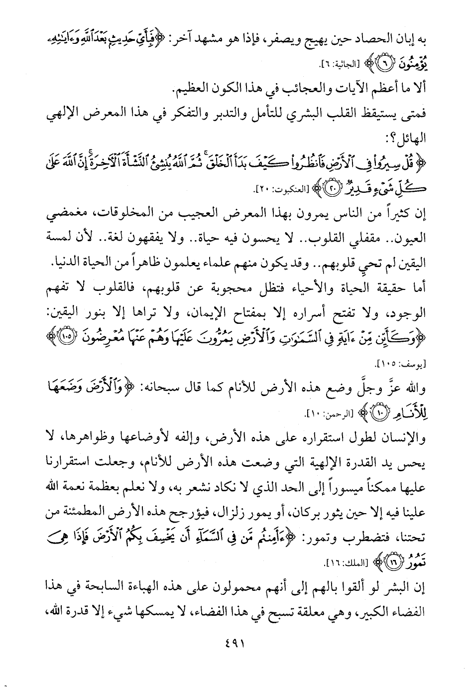 إن كثيراً من الناس يمرون بهذا المعرض العجيب من المخلوقات، مغمضي العيون .. مقفلي القلوب .. لا يحسون فيه حياة .. ولا يفقهون لغة .. لأن لمسة اليقين لم تحيِ قلوبهم .. وقد يكون منهم علماء يعلمون ظاهراً من الحياة الدنيا.