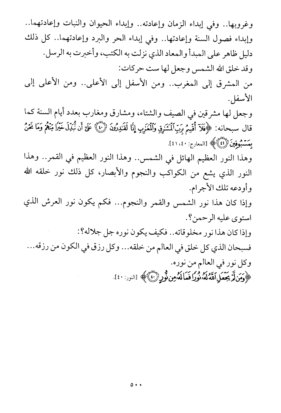 وغروبها .. وفي إبداء الزمان وإعادته .. وإبداء الحيوان والنبات وإعادتهما .. وإبداء فصول السنة وإعادتها .. وفي إبداء الحر والبرد وإعادتهما .. كل ذلك دليل ظاهر على المبدأ والمعاد الذي نزلت به الكتب، وأخبرت به الرسل.