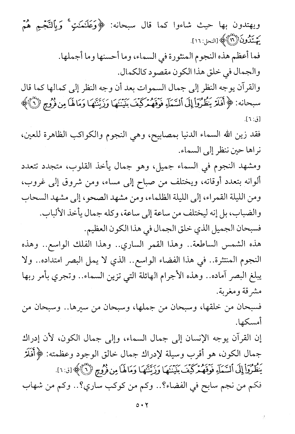 ومشهد النجوم في السماء جميل، وهو جمال يأخذ القلوب، متجدد تتعدد ألوانه بتعدد أوقاته، ويختلف من صباح إلى مساء، ومن شروق إلى غروب، ومن الليلة القمراء، إلى الليلة الظلماء، ومن مشهد الصحو، إلى مشهد السحاب والضباب، بل إنه ليختلف من ساعة إلى ساعة، وكله جمال يأخذ الألباب.