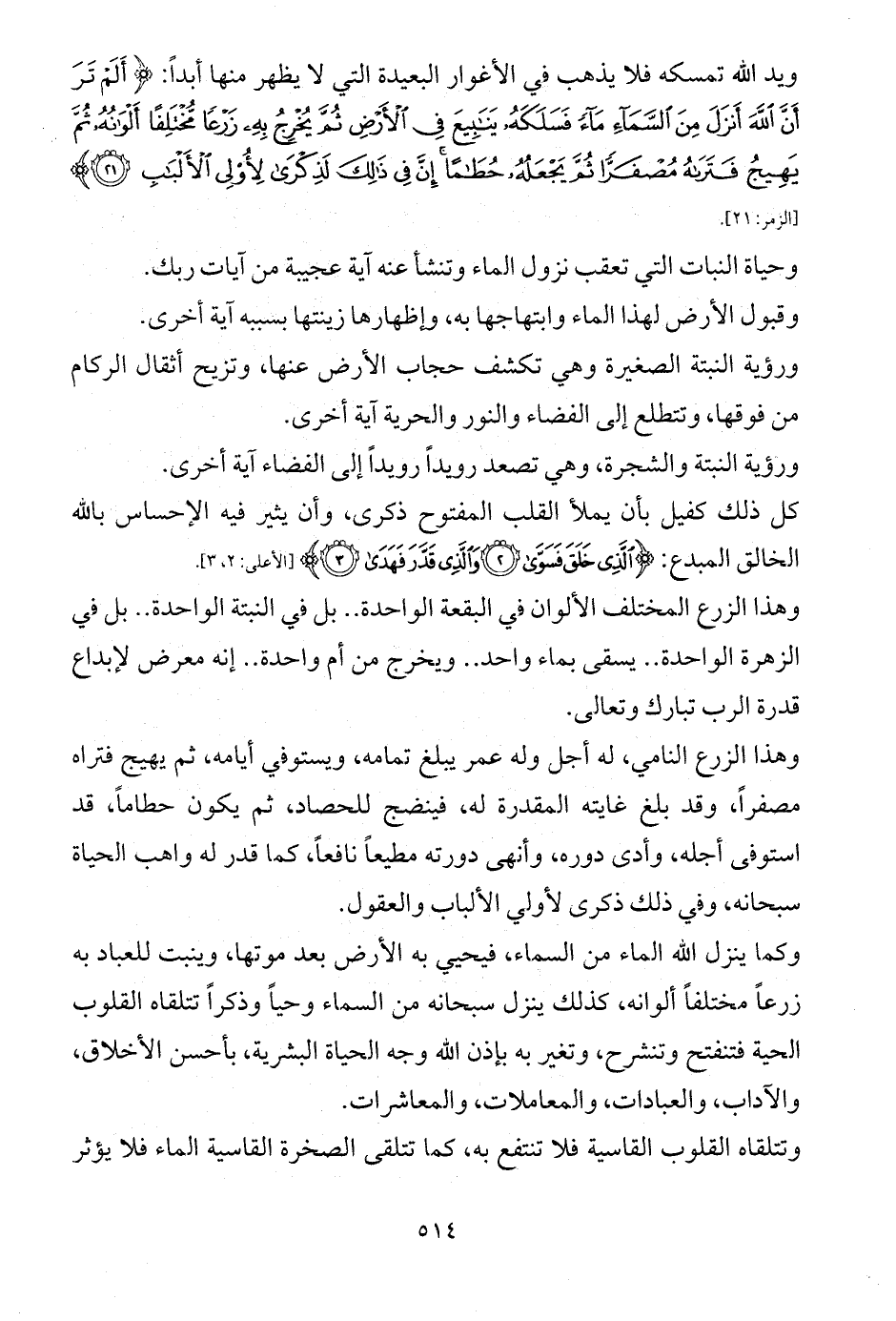 وكما ينزل الله الماء من السماء، فيحيي به الأرض بعد موتها، وينبت للعباد به زرعاً مختلفاً ألوانه، كذلك ينزل سبحانه من السماء وحياً وذكراً تتلقاه القلوب الحية فتنفتح وتنشرح، وتغير به بإذن الله وجه الحياة البشرية، بأحسن الأخلاق، والآداب، والعبادات، والمعاملات، والمعاشرات.