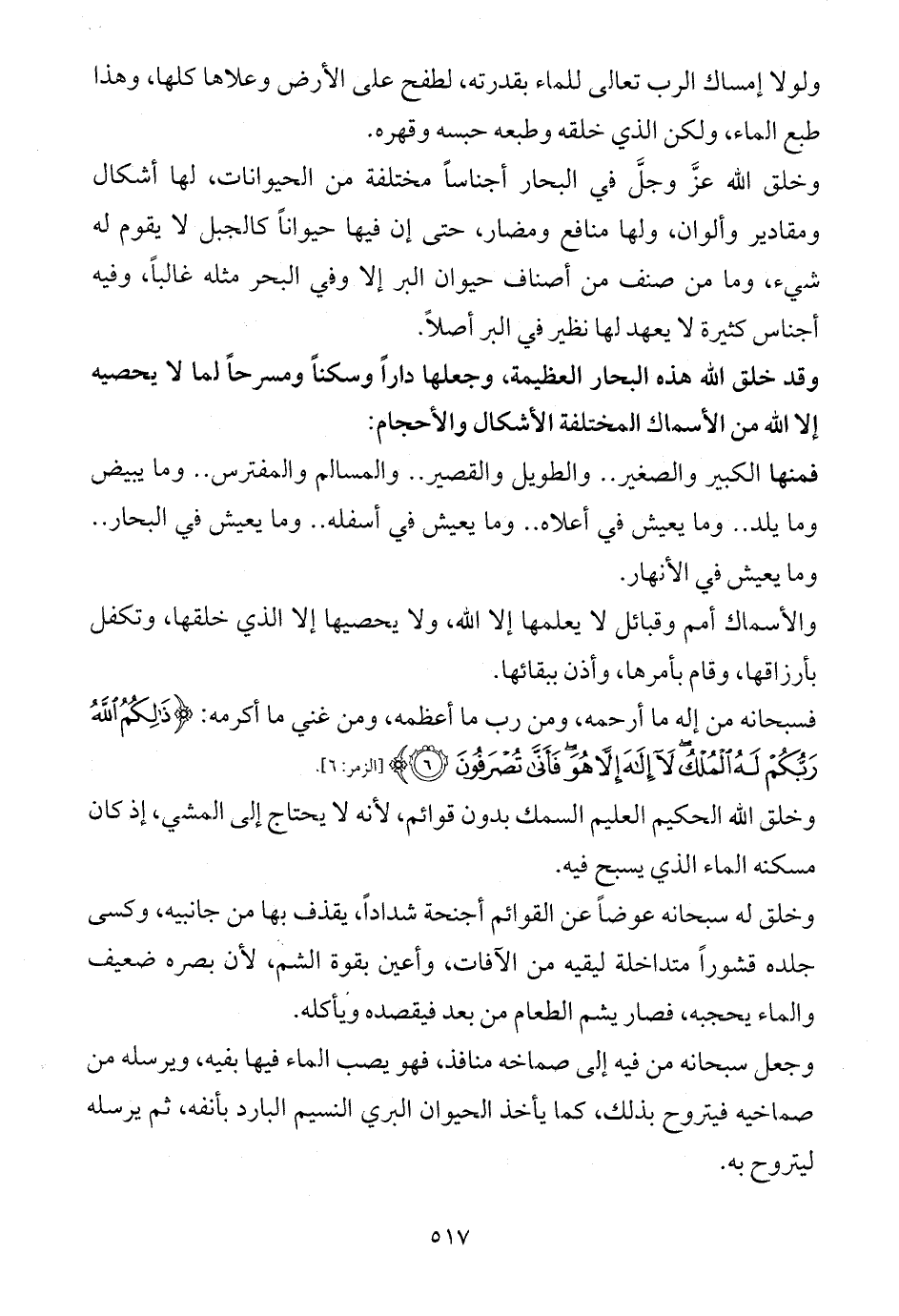 والأسماك أمم وقبائل لا يعلمها إلا الله، ولا يحصيها إلا الذي خلقها، وتكفل بأرزاقها، وقام بأمرها، وأذن ببقائها.