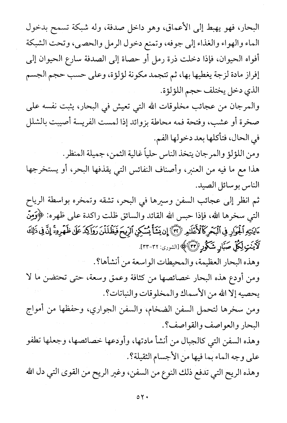 ثم انظر إلى عجائب السفن وسيرها في البحر، تشقه وتمخره بواسطة الرياح التي سخرها الله، فإذا حبس الله القائد والسائق ظلت راكدة على ظهره: {وَمِنْ آيَاتِهِ الْجَوَارِ فِي الْبَحْرِ كَالْأَعْلَامِ (32) إِنْ يَشَأْ يُسْكِنِ الرِّيحَ فَيَظْلَلْنَ رَوَاكِدَ عَلَى ظَهْرِهِ إِنَّ فِي ذَلِكَ لَآيَاتٍ لِكُلِّ صَبَّارٍ شَكُورٍ (33)} [الشورى: 32 - 33].