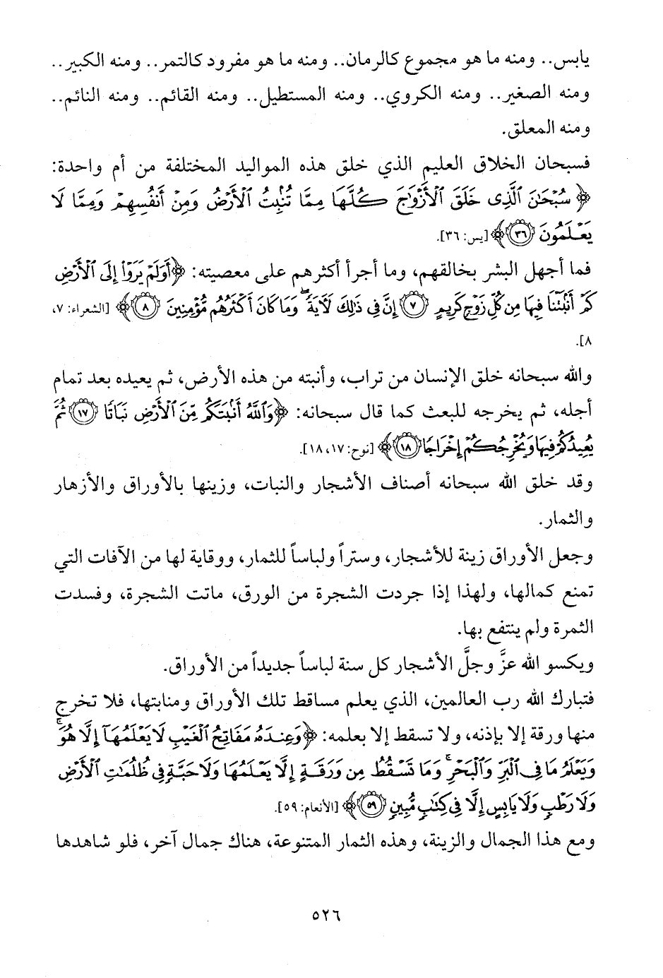 وجعل الأوراق زينة للأشجار، وستراً ولباساً للثمار، ووقاية لها من الآفات التي تمنع كمالها، ولهذا إذا جردت الشجرة من الورق، ماتت الشجرة، وفسدت الثمرة ولم ينتفع بها.