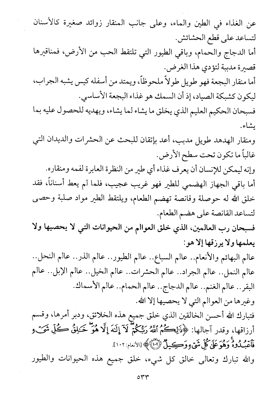 عالم البهائم والأنعام .. عالم السباع .. عالم الطيور .. عالم الذر .. عالم النحل .. عالم النمل .. عالم الجراد .. عالم الحشرات .. عالم الخيل .. عالم الإبل .. عالم البقر .. عالم الغنم .. عالم الدجاج .. عالم الحمام .. عالم الأسماك.
