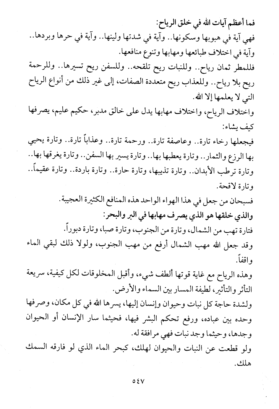 فيجعلها رخاء تارة .. وعاصفة تارة .. ورحمة تارة .. وعذاباً تارة .. وتارة يحيي بها الرزع والثمار .. وتارة يعطبها بها .. وتارة يسير بها السفن .. وتارة يغرقها بها .. وتارة ترطب الأبدان .. وتارة تذيبها، وتارة حارة .. وتارة باردة .. وتارة عقيماً .. وتارة لاقحة.