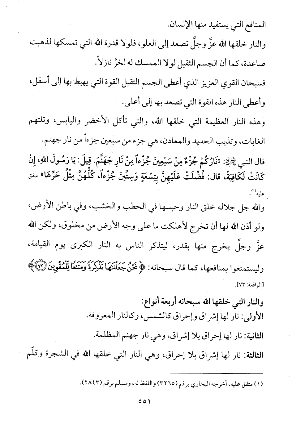 قال النبي - صلى الله عليه وسلم -: «نَارُكُمْ جُزْءٌ مِنْ سَبْعِينَ جُزْءاً مِنْ نَارِ جَهَنَّمَ. قِيلَ: يَا رَسُولَ اللهِ، إِنْ كَانَتْ لَكَافِيَةً، قال: فُضِّلَتْ عَلَيْهِنَّ بِتِسْعَةٍ وَسِتِّينَ جُزْءاً، كُلُّهُنَّ مِثْلُ حَرِّهَا» متفق عليه (¬1).