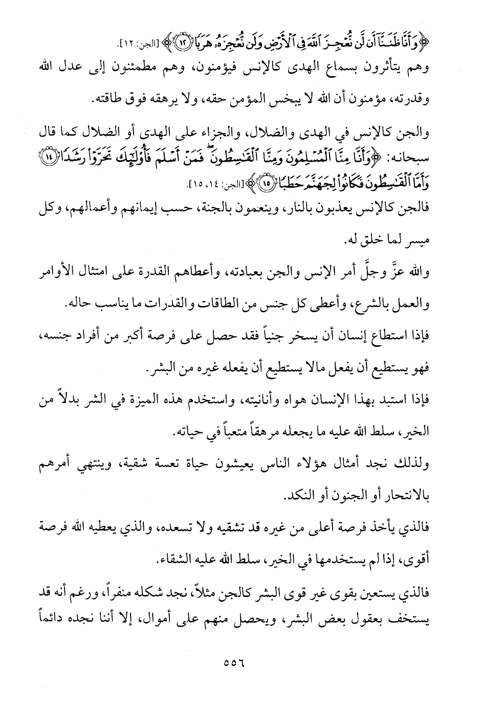 والجن كالإنس في الهدى والضلال، والجزاء على الهدى أو الضلال كما قال سبحانه: {وَأَنَّا مِنَّا الْمُسْلِمُونَ وَمِنَّا الْقَاسِطُونَ فَمَنْ أَسْلَمَ فَأُولَئِكَ تَحَرَّوْا رَشَدًا (14) وَأَمَّا الْقَاسِطُونَ فَكَانُوا لِجَهَنَّمَ حَطَبًا (15)} [الجن: 14، 15].