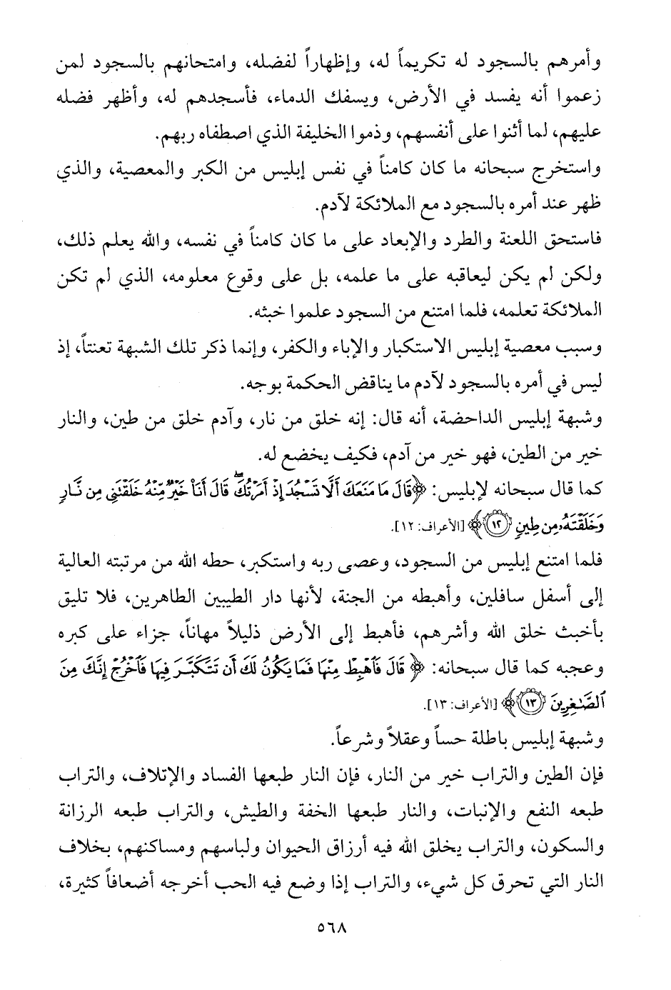 وشبهة إبليس الداحضة، أنه قال: إنه خلق من نار، وآدم خلق من طين، والنار خير من الطين، فهو خير من آدم، فكيف يخضع له.