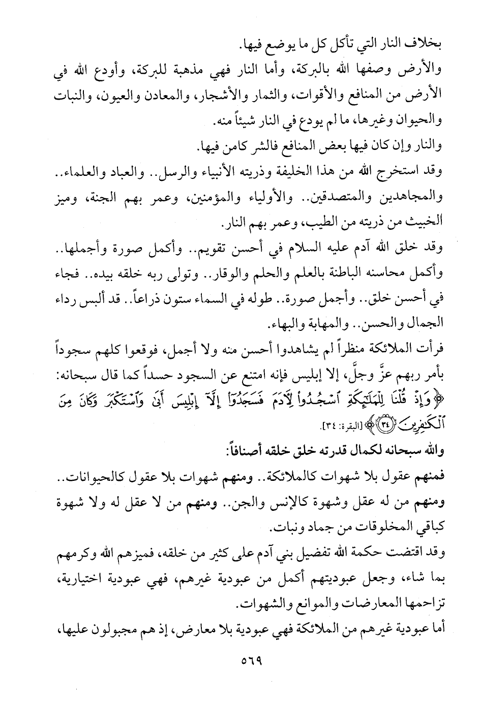 والأرض وصفها الله بالبركة، وأما النار فهي مذهبة للبركة، وأودع الله في الأرض من المنافع والأقوات، والثمار والأشجار، والمعادن والعيون، والنبات والحيوان وغيرها، ما لم يودع في النار شيئاً منه.