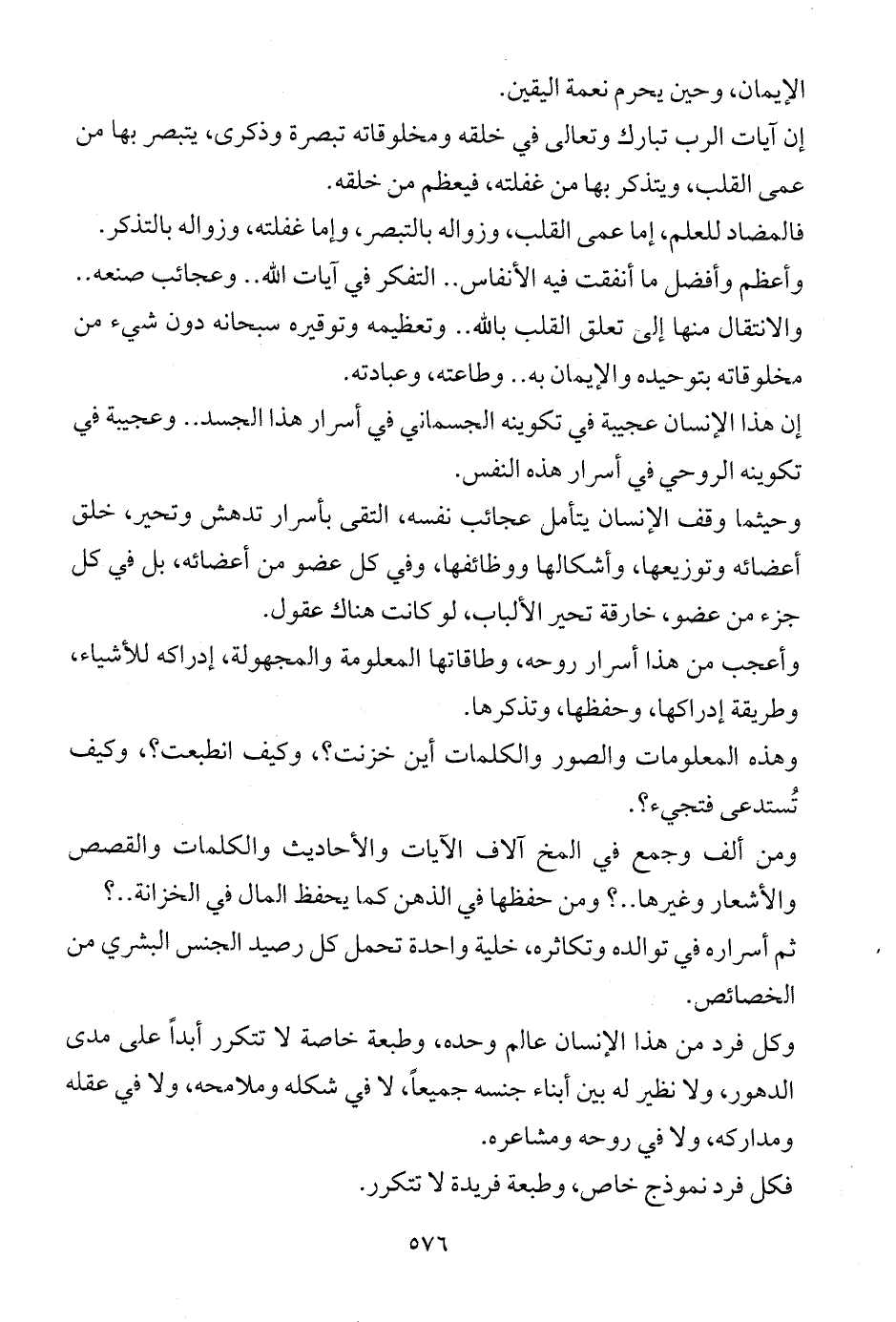 وكل فرد من هذا الإنسان عالم وحده، وطبعة خاصة لا تتكرر أبداً على مدى الدهور، ولا نظير له بين أبناء جنسه جميعاً، لا في شكله وملامحه، ولا في عقله ومداركه، ولا في روحه ومشاعره.