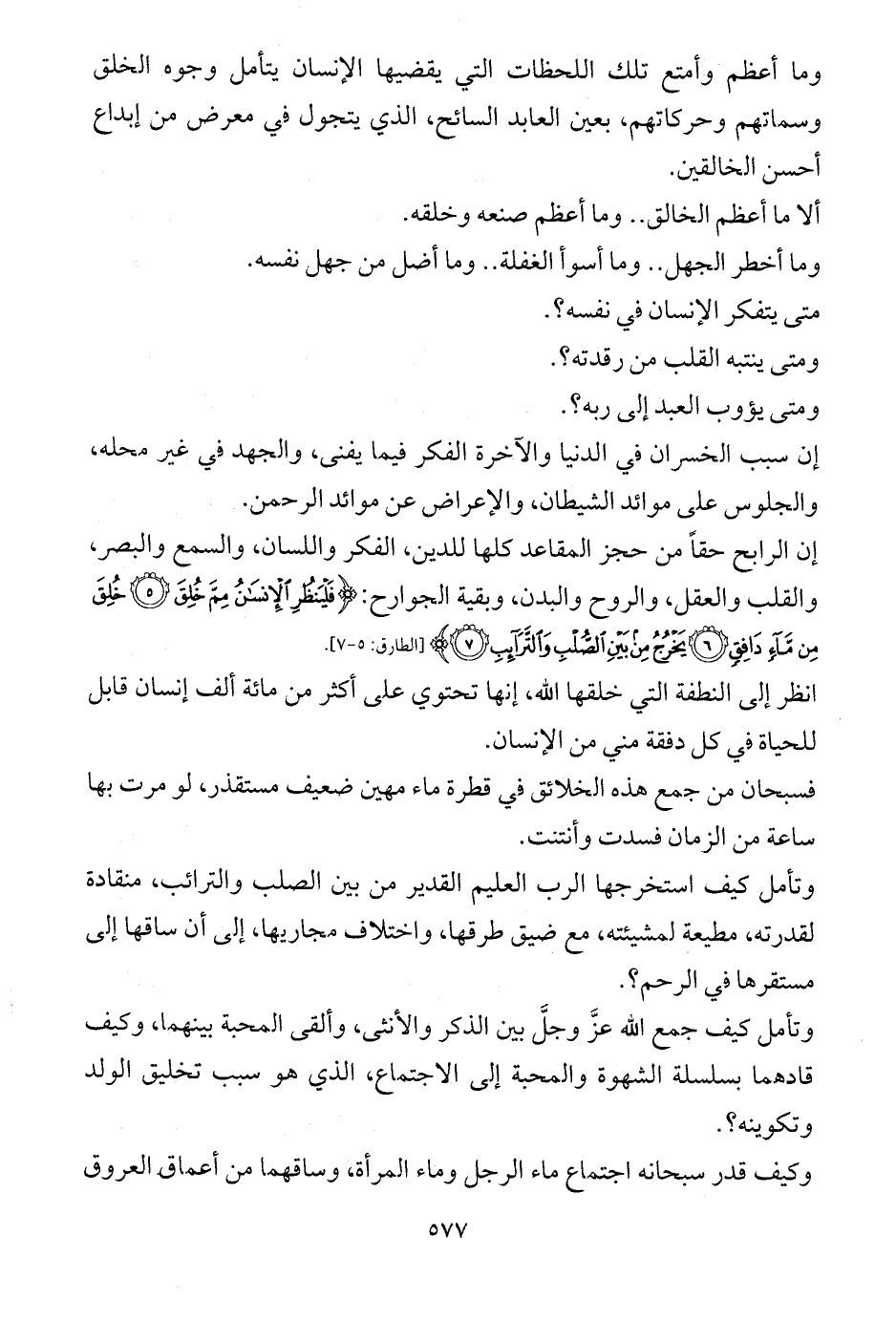 وتأمل كيف استخرجها الرب العليم القدير من بين الصلب والترائب، منقادة لقدرته، مطيعة لمشيئته، مع ضيق طرقها، واختلاف مجاريها، إلى أن ساقها إلى مستقرها في الرحم؟.