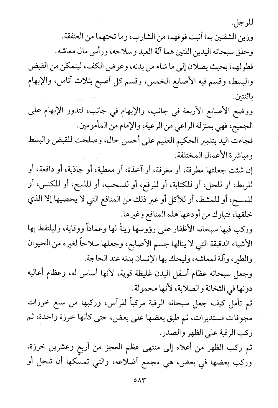 فطولهما بحيث يصلان إلى ما شاء من بدنه، وعرض الكف، ليتمكن من القبض والبسط، وقسم فيه الأصابع الخمس، وقسم كل أصبع بثلاث أنامل، والإبهام باثنتين.