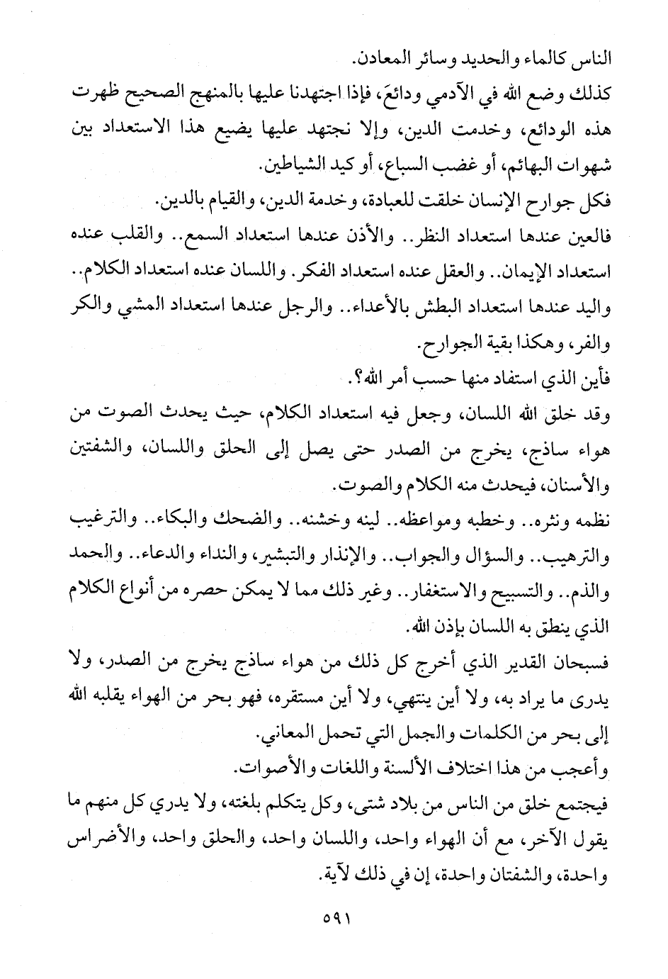 فالعين عندها استعداد النظر .. والأذن عندها استعداد السمع .. والقلب عنده استعداد الإيمان .. والعقل عنده استعداد الفكر. واللسان عنده استعداد الكلام .. واليد عندها استعداد البطش بالأعداء .. والرجل عندها استعداد المشي والكر والفر، وهكذا بقية الجوارح.