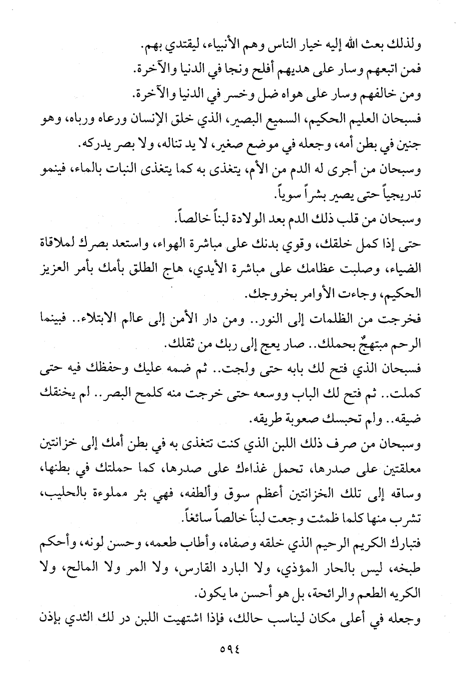 وسبحان من صرف ذلك اللبن الذي كنت تتغذى به في بطن أمك إلى خزانتين معلقتين على صدرها، تحمل غذاءك على صدرها، كما حملتك في بطنها، وساقه إلى تلك الخزانتين أعظم سوق وألطفه، فهي بئر مملوءة بالحليب، تشرب منها كلما ظمئت وجعت لبناً خالصاً سائغاً.