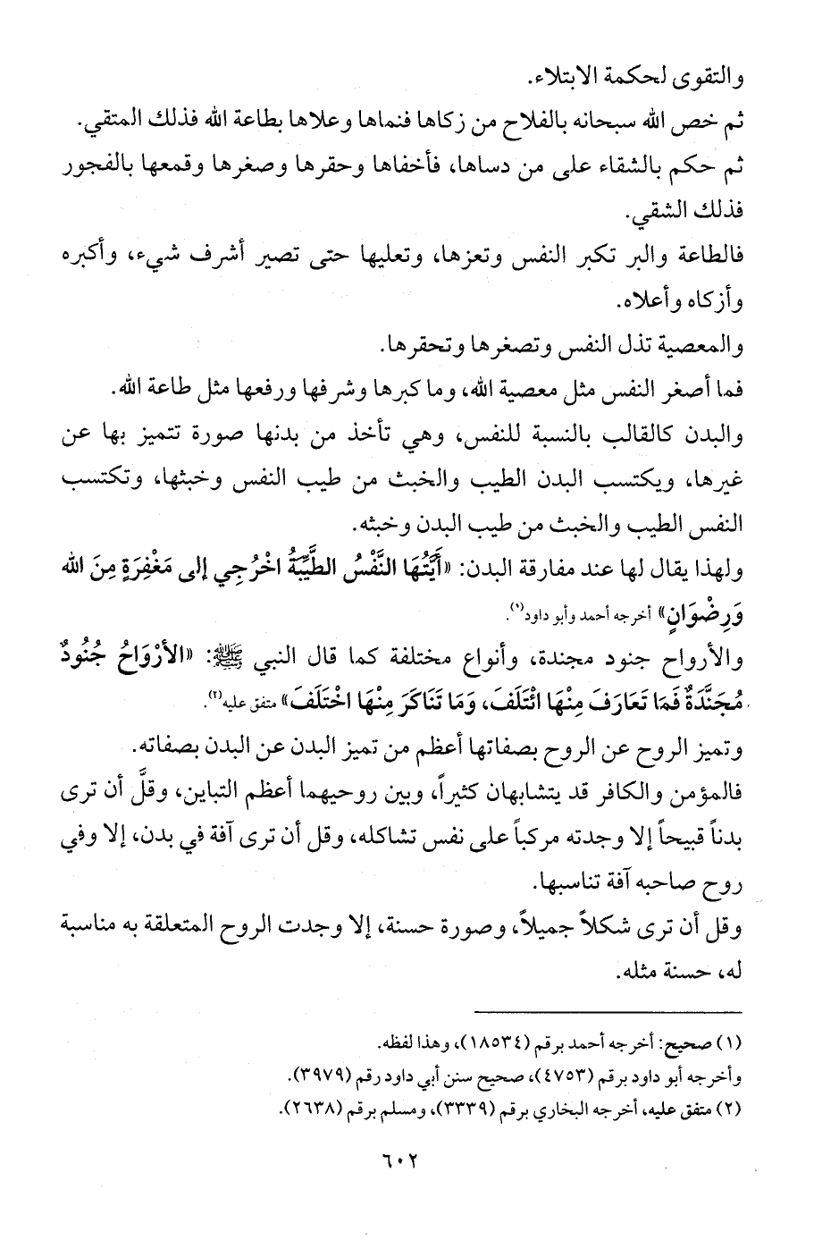 ولهذا يقال لها عند مفارقة البدن: «أَيَّتُهَا النَّفْسُ الطَّيِّبَةُ اخْرُجِي إلى مَغْفِرَةٍ مِنَ الله وَرِضْوَانٍ» أخرجه أحمد وأبو داود (¬1).