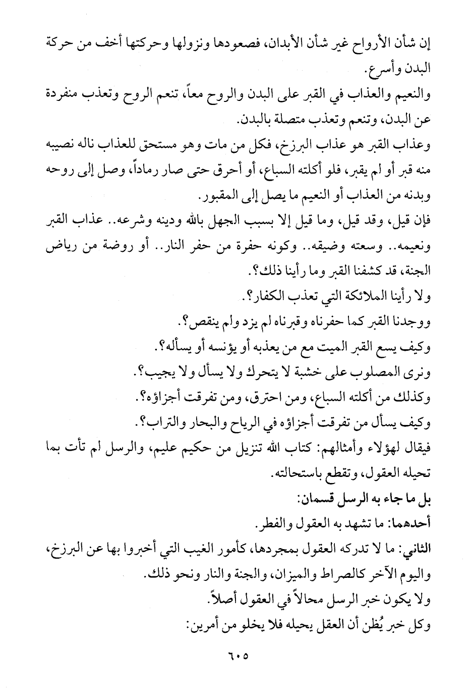والنعيم والعذاب في القبر على البدن والروح معاً، تنعم الروح وتعذب منفردة عن البدن، وتنعم وتعذب متصلة بالبدن.