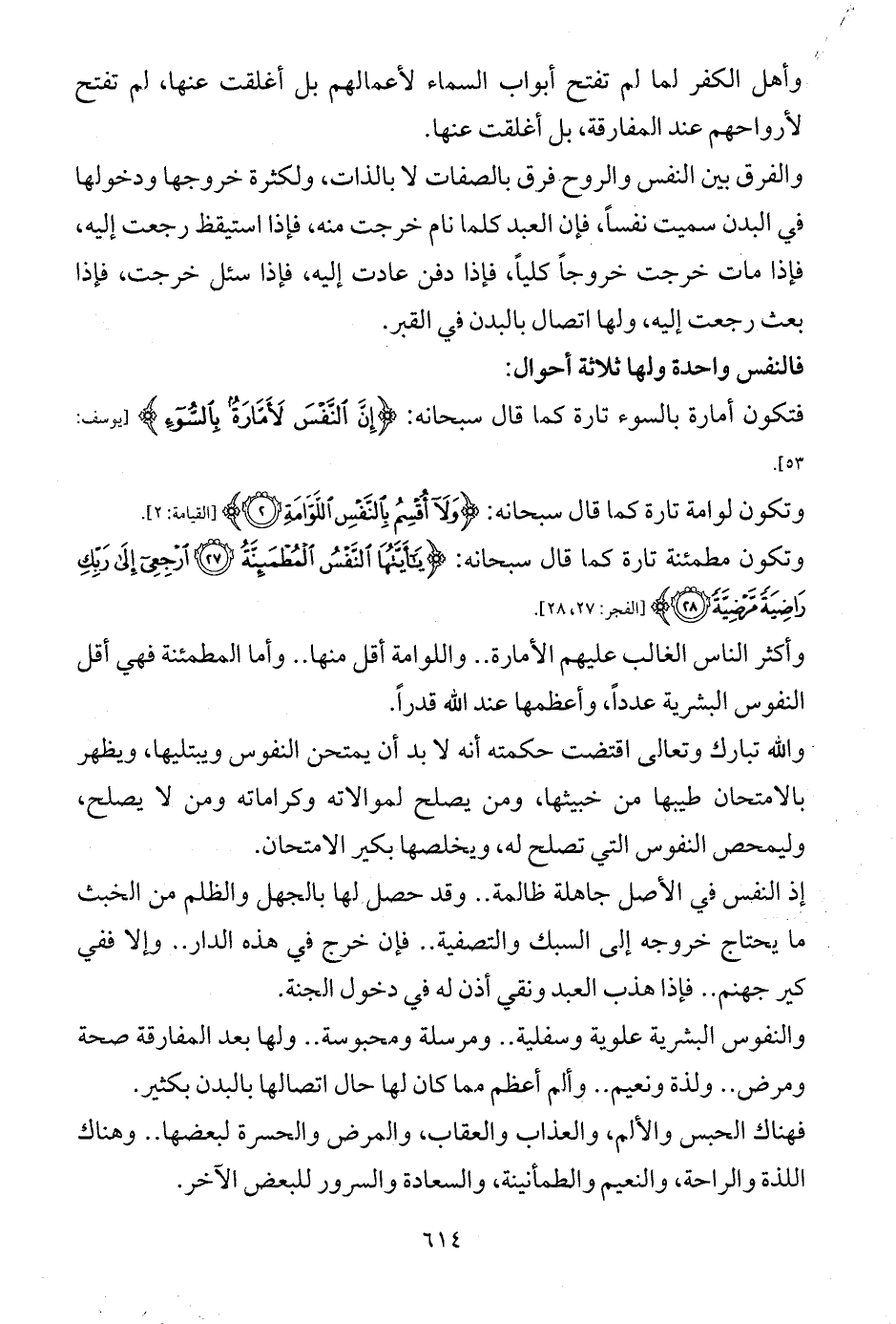 وتكون مطمئنة تارة كما قال سبحانه: {يَاأَيَّتُهَا النَّفْسُ الْمُطْمَئِنَّةُ (27) ارْجِعِي إِلَى رَبِّكِ رَاضِيَةً مَرْضِيَّةً (28)} [الفجر: 27، 28].