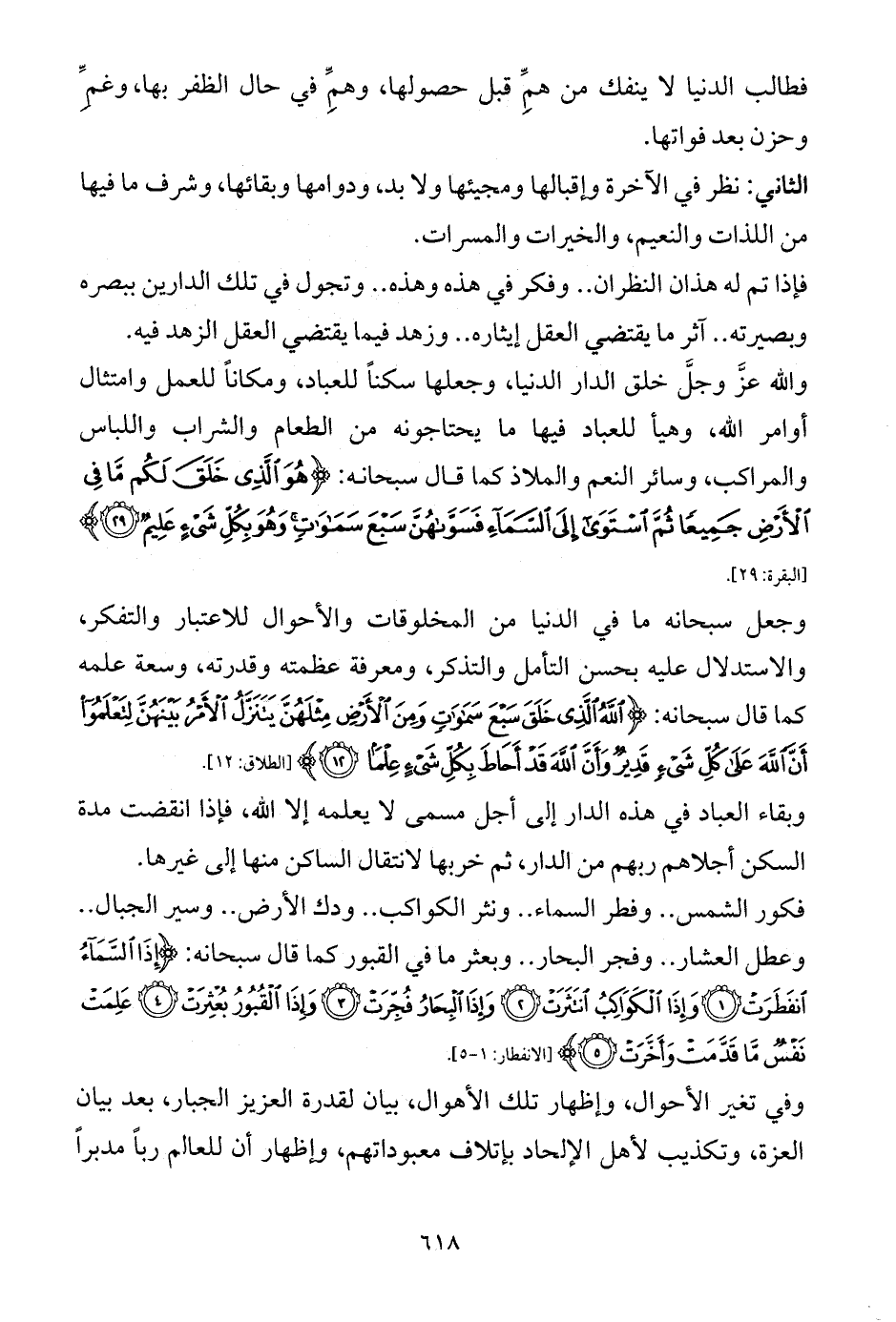 وجعل سبحانه ما في الدنيا من المخلوقات والأحوال للاعتبار والتفكر، والاستدلال عليه بحسن التأمل والتذكر، ومعرفة عظمته وقدرته، وسعة علمه كما قال سبحانه: {اللَّهُ الَّذِي خَلَقَ سَبْعَ سَمَاوَاتٍ وَمِنَ الْأَرْضِ مِثْلَهُنَّ يَتَنَزَّلُ الْأَمْرُ بَيْنَهُنَّ لِتَعْلَمُوا أَنَّ اللَّهَ عَلَى كُلِّ شَيْءٍ قَدِيرٌ وَأَنَّ اللَّهَ قَدْ أَحَاطَ بِكُلِّ شَيْءٍ عِلْمًا (12)} [الطلاق: 12].