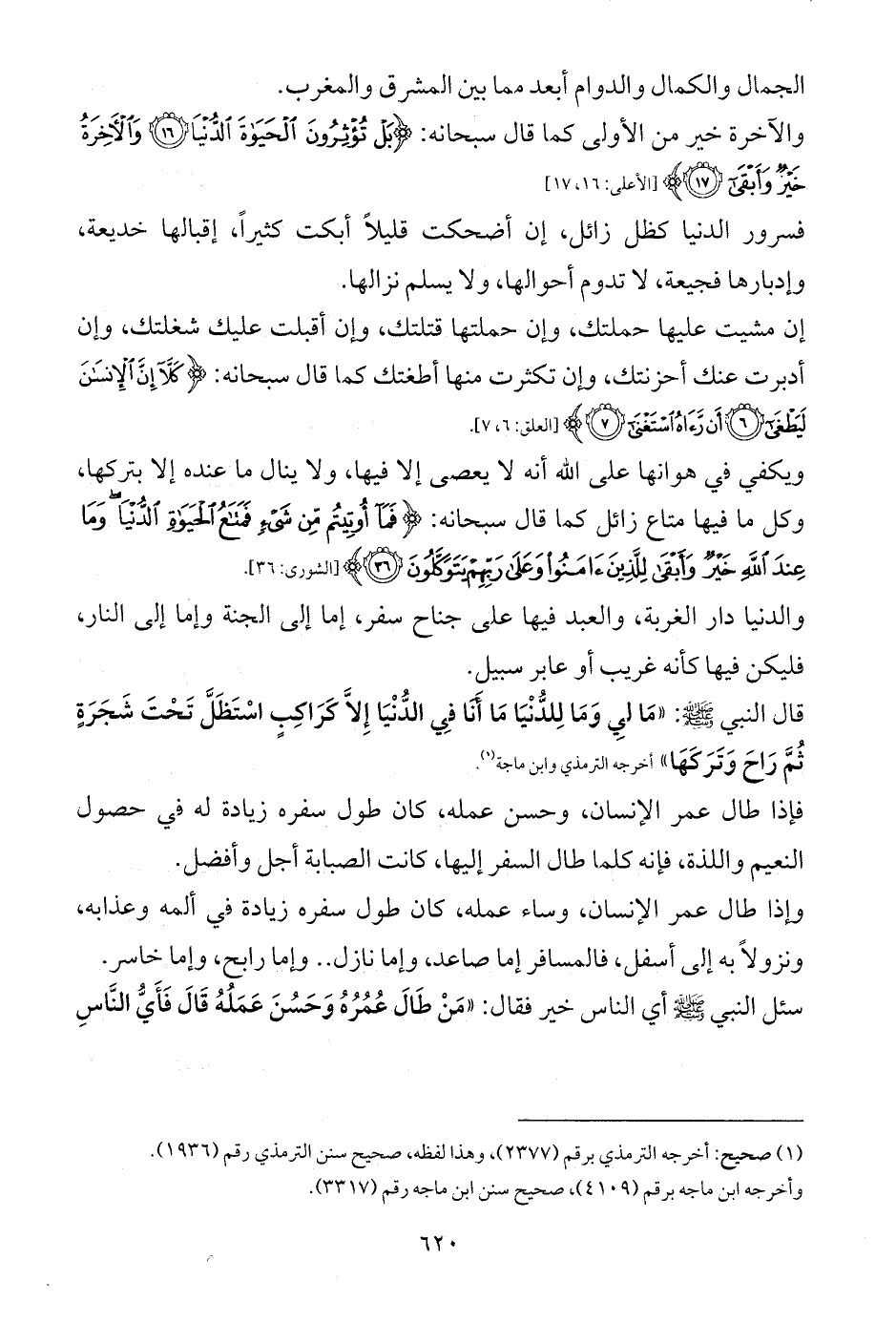 فإذا طال عمر الإنسان، وحسن عمله، كان طول سفره زيادة له في حصول النعيم واللذة، فإنه كلما طال السفر إليها، كانت الصبابة أجل وأفضل.