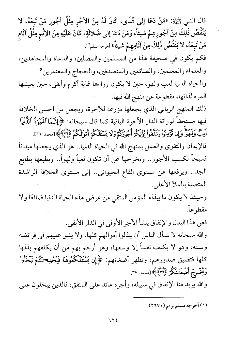 قال النبي - صلى الله عليه وسلم -: «مَنْ دَعَا إلى هُدًى، كَانَ لَهُ مِنَ الأجْرِ مِثْلُ أجُورِ مَنْ تَبِعَهُ، لا يَنْقُصُ ذَلِكَ مِنْ أجُورِهِمْ شيئاً، وَمَنْ دَعَا إلى ضَلالَةٍ، كَانَ عَلَيْهِ مِنَ الإثْمِ مِثْلُ آثَامِ مَنْ تَبِعَهُ، لا يَنْقُصُ ذَلِكَ مِنْ آثَامِهِمْ شيئاً» أخرجه مسلم (¬1).