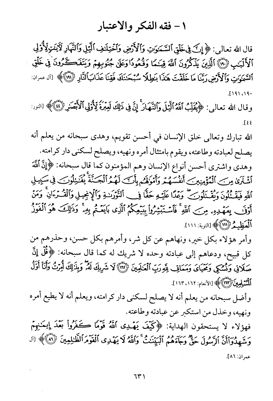 قال الله تعالى: {إِنَّ فِي خَلْقِ السَّمَاوَاتِ وَالْأَرْضِ وَاخْتِلَافِ اللَّيْلِ وَالنَّهَارِ لَآيَاتٍ لِأُولِي الْأَلْبَابِ (190) الَّذِينَ يَذْكُرُونَ اللَّهَ قِيَامًا وَقُعُودًا وَعَلَى جُنُوبِهِمْ وَيَتَفَكَّرُونَ فِي خَلْقِ السَّمَاوَاتِ وَالْأَرْضِ رَبَّنَا مَا خَلَقْتَ هَذَا بَاطِلًا سُبْحَانَكَ فَقِنَا عَذَابَ النَّارِ (191)} [آل عمران: 190، 191].