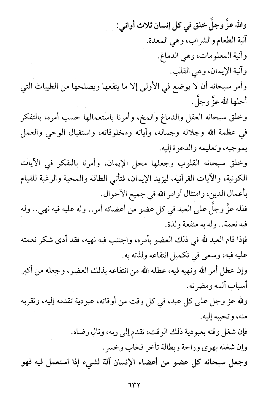 فلله عزَّ وجلَّ على العبد في كل عضو من أعضائه أمر .. وله عليه فيه نهي .. وله فيه نعمة .. وله به منفعة ولذة.
