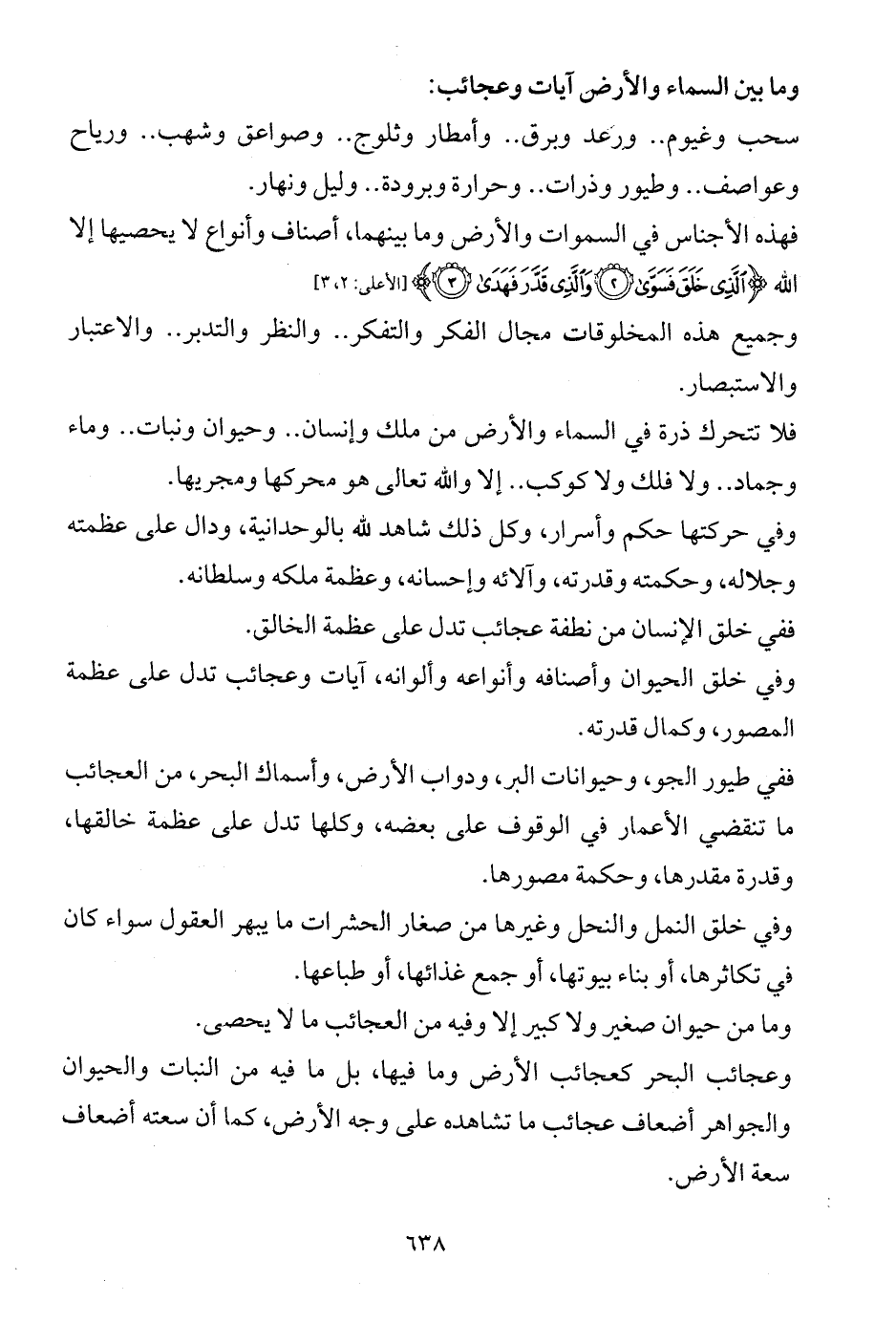 ففي طيور الجو، وحيوانات البر، ودواب الأرض، وأسماك البحر، من العجائب ما تنقضي الأعمار في الوقوف على بعضه، وكلها تدل على عظمة خالقها، وقدرة مقدرها، وحكمة مصورها.