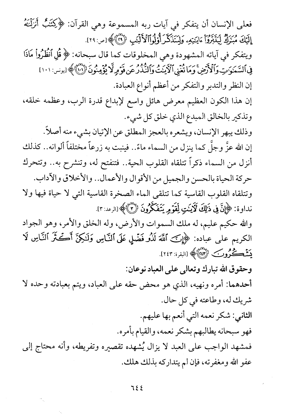 ويتفكر في آياته المشهودة وهي المخلوقات كما قال سبحانه: {قُلِ انْظُرُوا مَاذَا فِي السَّمَاوَاتِ وَالْأَرْضِ وَمَا تُغْنِي الْآيَاتُ وَالنُّذُرُ عَنْ قَوْمٍ لَا يُؤْمِنُونَ (101)} [يونس: 101]