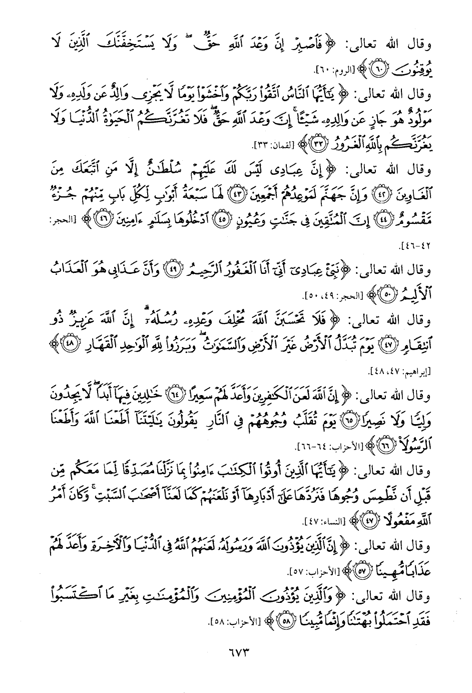 وقال الله تعالى: {إِنَّ عِبَادِي لَيْسَ لَكَ عَلَيْهِمْ سُلْطَانٌ إِلَّا مَنِ اتَّبَعَكَ مِنَ الْغَاوِينَ (42) وَإِنَّ جَهَنَّمَ لَمَوْعِدُهُمْ أَجْمَعِينَ (43) لَهَا سَبْعَةُ أَبْوَابٍ لِكُلِّ بَابٍ مِنْهُمْ جُزْءٌ مَقْسُومٌ (44) إِنَّ الْمُتَّقِينَ فِي جَنَّاتٍ وَعُيُونٍ (45) ادْخُلُوهَا بِسَلَامٍ آمِنِينَ (46)} [الحجر: 42 - 46].