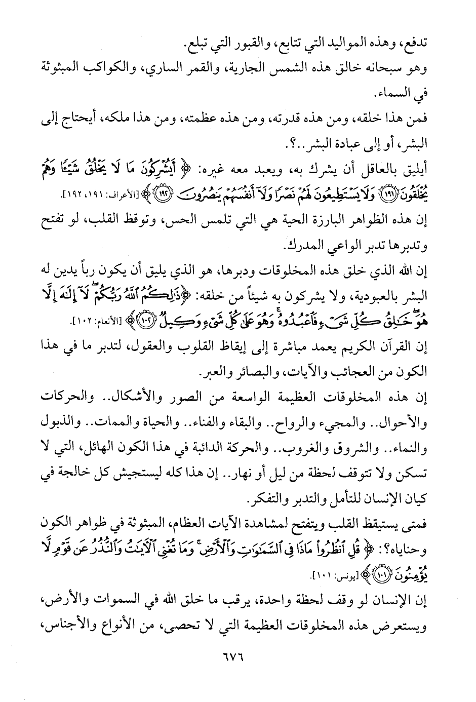 إن الله الذي خلق هذه المخلوقات ودبرها، هو الذي يليق أن يكون رباً يدين له البشر بالعبودية، ولا يشركون به شيئاً من خلقه: {ذَلِكُمُ اللَّهُ رَبُّكُمْ لَا إِلَهَ إِلَّا هُوَ خَالِقُ كُلِّ شَيْءٍ فَاعْبُدُوهُ وَهُوَ عَلَى كُلِّ شَيْءٍ وَكِيلٌ (102)} [الأنعام: 102].