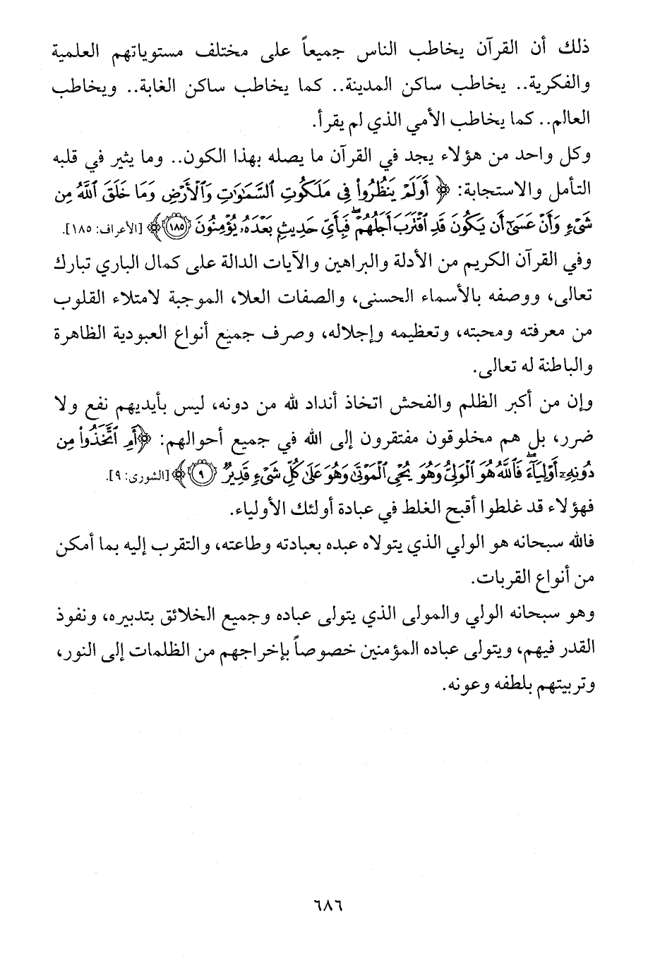 ذلك أن القرآن يخاطب الناس جميعاً على مختلف مستوياتهم العلمية والفكرية .. يخاطب ساكن المدينة .. كما يخاطب ساكن الغابة .. ويخاطب العالم .. كما يخاطب الأمي الذي لم يقرأ.