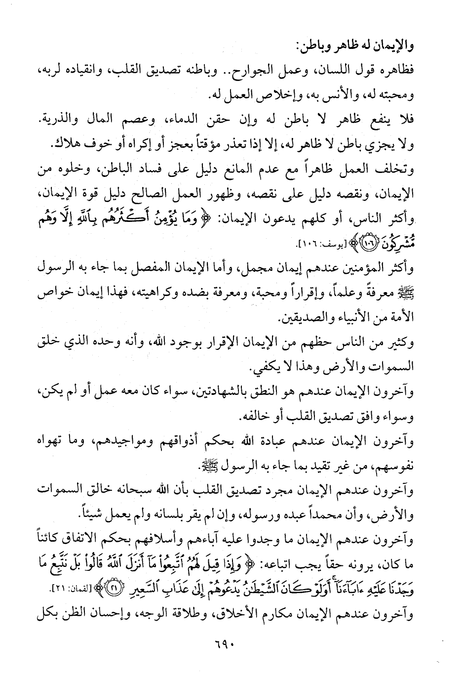 فظاهره قول اللسان، وعمل الجوارح .. وباطنه تصديق القلب، وانقياده لربه، ومحبته له، والأنس به، وإخلاص العمل له.