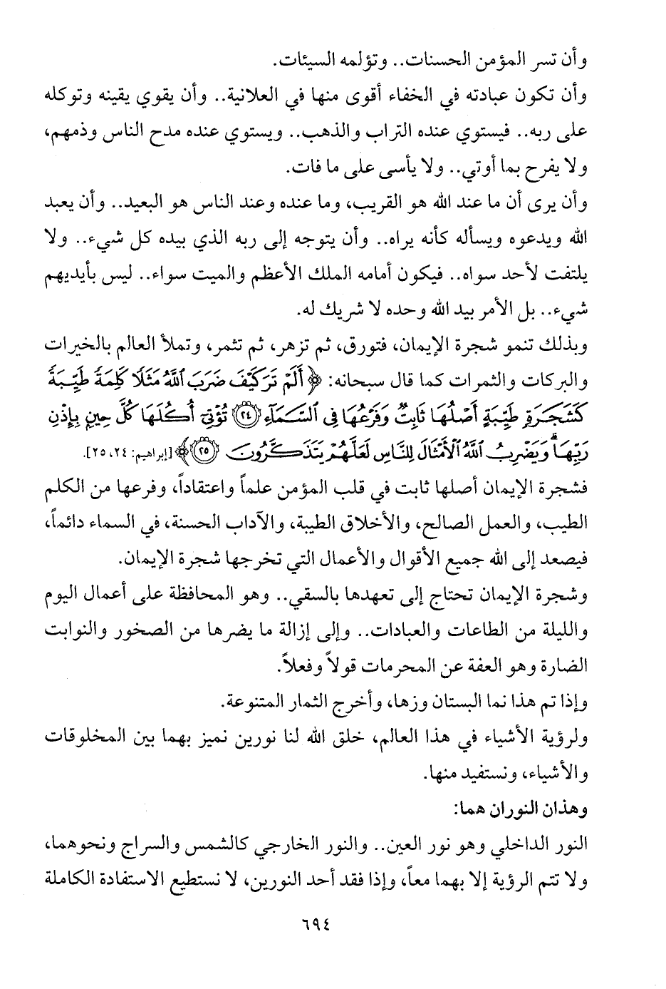 وبذلك تنمو شجرة الإيمان، فتورق، ثم تزهر، ثم تثمر، وتملأ العالم بالخيرات والبركات والثمرات كما قال سبحانه: {أَلَمْ تَرَ كَيْفَ ضَرَبَ اللَّهُ مَثَلًا كَلِمَةً طَيِّبَةً كَشَجَرَةٍ طَيِّبَةٍ أَصْلُهَا ثَابِتٌ وَفَرْعُهَا فِي السَّمَاءِ (24) تُؤْتِي أُكُلَهَا كُلَّ حِينٍ بِإِذْنِ رَبِّهَا وَيَضْرِبُ اللَّهُ الْأَمْثَالَ لِلنَّاسِ لَعَلَّهُمْ يَتَذَكَّرُونَ (25)} [إبراهيم: 24، 25].