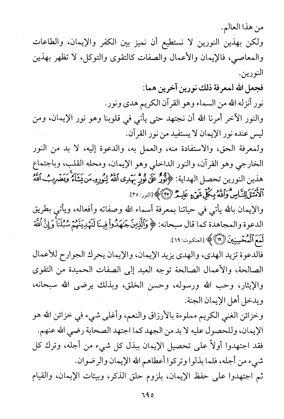 ولكن بهذين النورين لا نستطيع أن نميز بين الكفر والإيمان، والطاعات والمعاصي، فالإيمان والأعمال والصفات كالتقوى والتوكل، لا تظهر بهذين النورين.