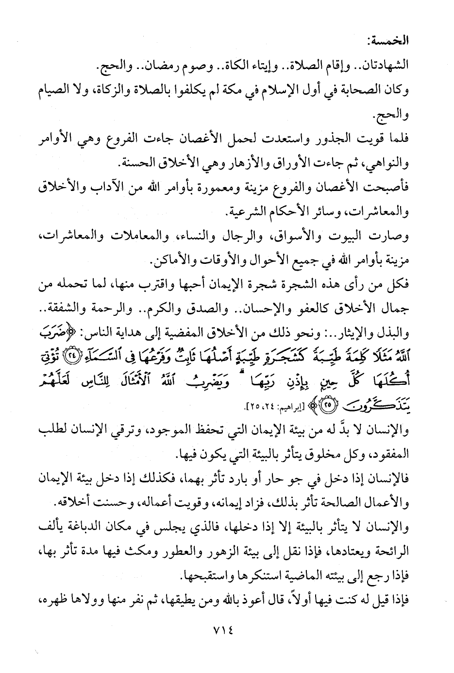 فلما قويت الجذور واستعدت لحمل الأغصان جاءت الفروع وهي الأوامر والنواهي، ثم جاءت الأوراق والأزهار وهي الأخلاق الحسنة.