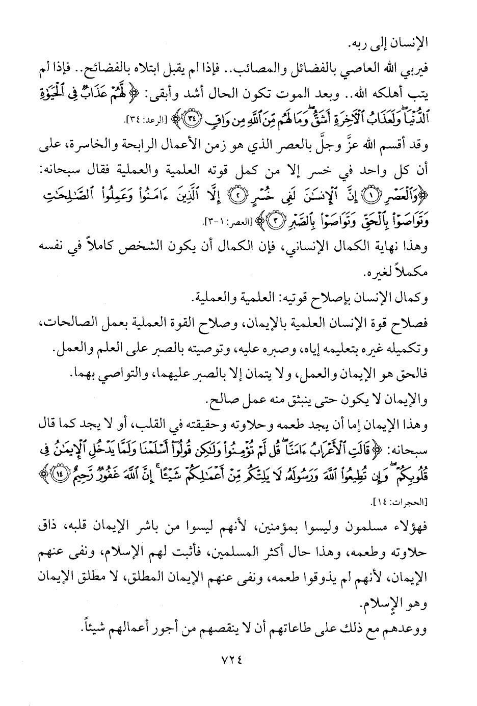 فصلاح قوة الإنسان العلمية بالإيمان، وصلاح القوة العملية بعمل الصالحات، وتكميله غيره بتعليمه إياه، وصبره عليه، وتوصيته بالصبر على العلم والعمل.