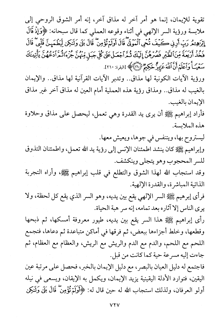 تقوية للإيمان، إنما هو أمر آخر له مذاق آخر، إنه أمر الشوق الروحي إلى ملابسة ورؤية السر الإلهي في أثناء وقوعه العملي كما قال سبحانه: {وَإِذْ قَالَ إِبْرَاهِيمُ رَبِّ أَرِنِي كَيْفَ تُحْيِ الْمَوْتَى قَالَ أَوَلَمْ تُؤْمِنْ قَالَ بَلَى وَلَكِنْ لِيَطْمَئِنَّ قَلْبِي قَالَ فَخُذْ أَرْبَعَةً مِنَ الطَّيْرِ فَصُرْهُنَّ إِلَيْكَ ثُمَّ اجْعَلْ عَلَى كُلِّ جَبَلٍ مِنْهُنَّ جُزْءًا ثُمَّ ادْعُهُنَّ يَأْتِينَكَ سَعْيًا وَاعْلَمْ أَنَّ اللَّهَ عَزِيزٌ حَكِيمٌ (260)} [البقرة: 260].