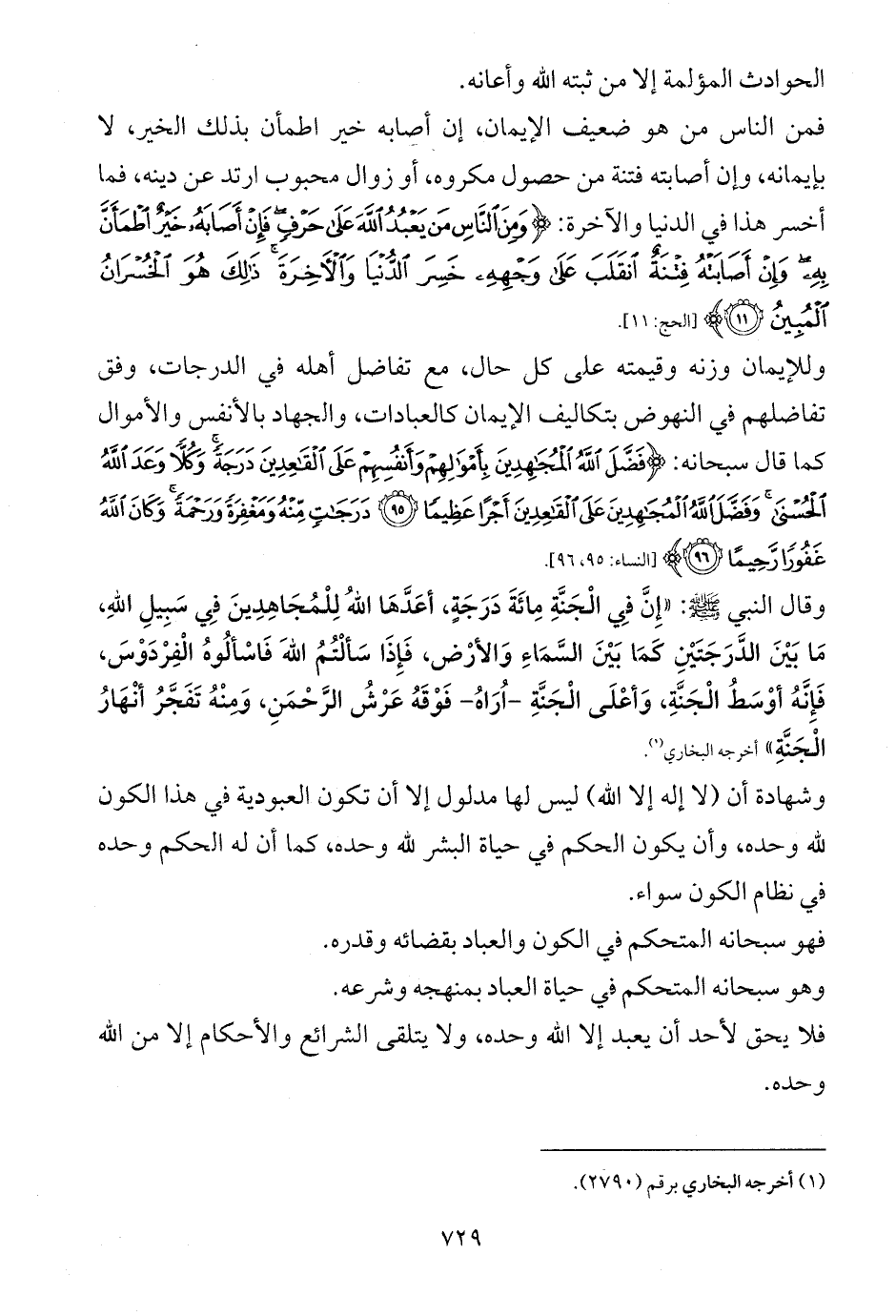 وللإيمان وزنه وقيمته على كل حال، مع تفاضل أهله في الدرجات، وفق تفاضلهم في النهوض بتكاليف الإيمان كالعبادات، والجهاد بالأنفس والأموال كما قال سبحانه: {فَضَّلَ اللَّهُ الْمُجَاهِدِينَ بِأَمْوَالِهِمْ وَأَنْفُسِهِمْ عَلَى الْقَاعِدِينَ دَرَجَةً وَكُلًّا وَعَدَ اللَّهُ الْحُسْنَى وَفَضَّلَ اللَّهُ الْمُجَاهِدِينَ عَلَى الْقَاعِدِينَ أَجْرًا عَظِيمًا (95) دَرَجَاتٍ مِنْهُ وَمَغْفِرَةً وَرَحْمَةً وَكَانَ اللَّهُ غَفُورًا رَحِيمًا (96)} [النساء: 95، 96].