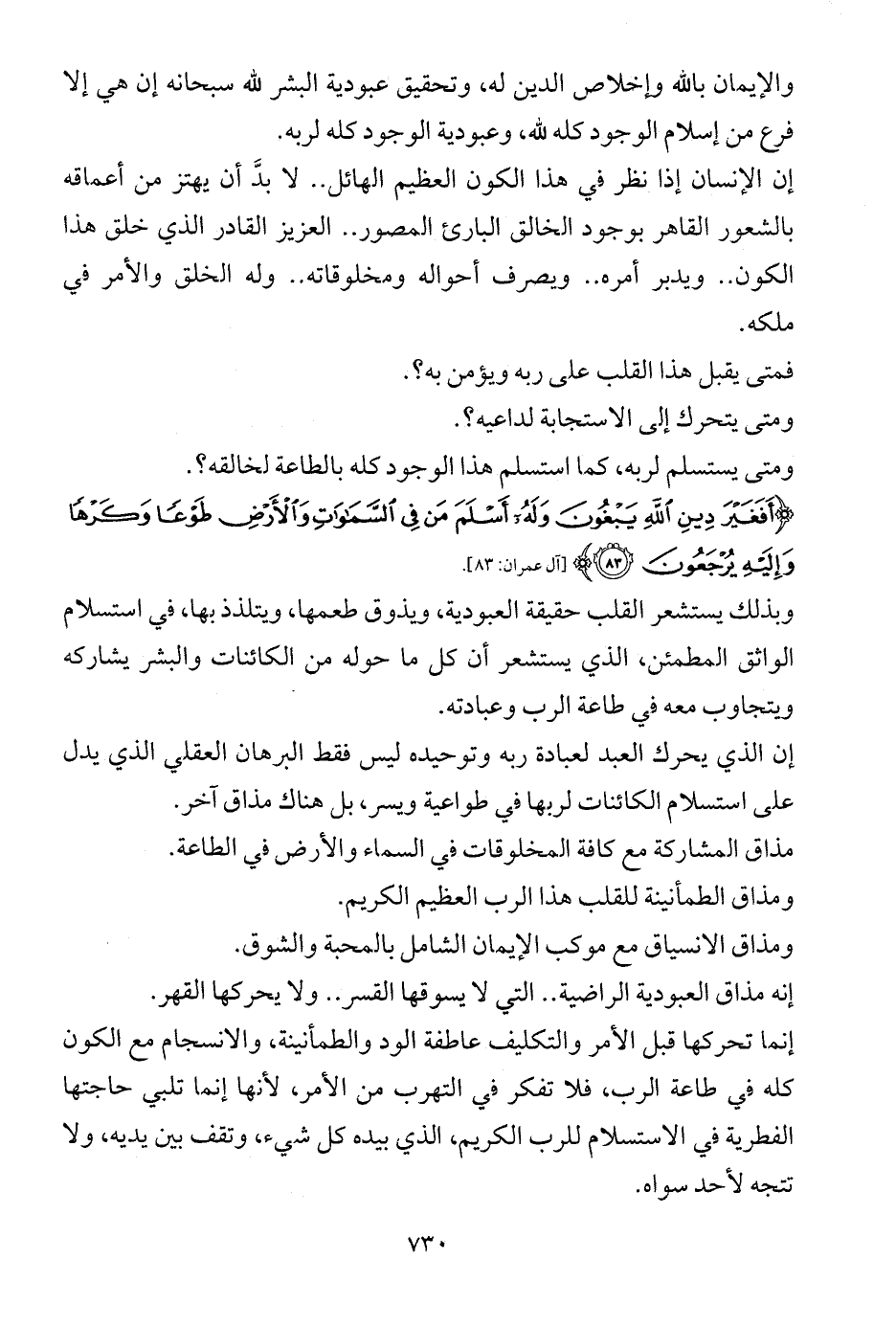 والإيمان بالله وإخلاص الدين له، وتحقيق عبودية البشر لله سبحانه إن هي إلا فرع من إسلام الوجود كله لله، وعبودية الوجود كله لربه.
