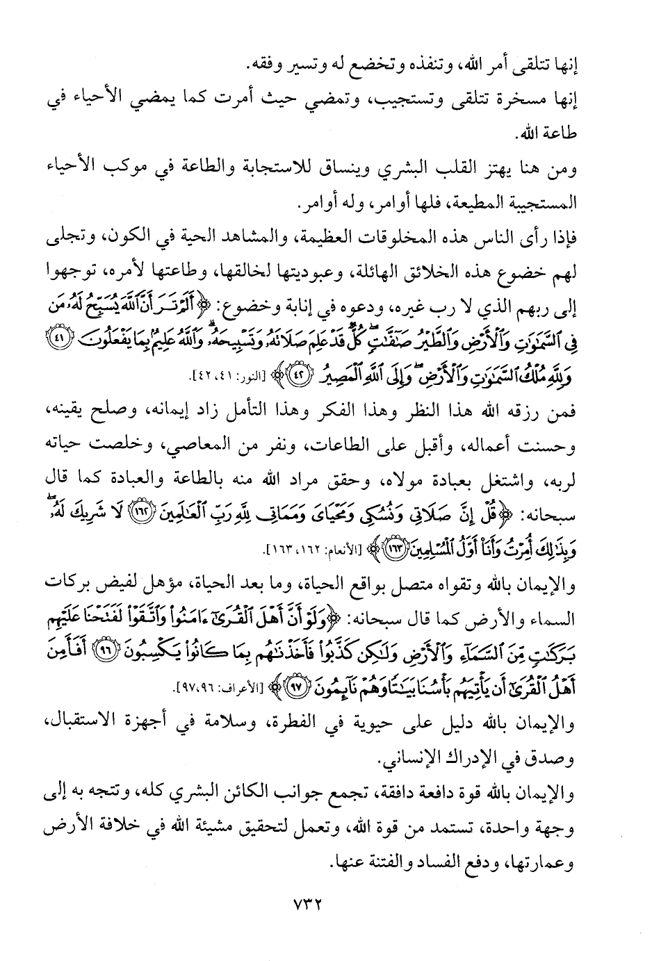 والإيمان بالله قوة دافعة دافقة، تجمع جوانب الكائن البشري كله، وتتجه به إلى وجهة واحدة، تستمد من قوة الله، وتعمل لتحقيق مشيئة الله في خلافة الأرض وعمارتها، ودفع الفساد والفتنة عنها.