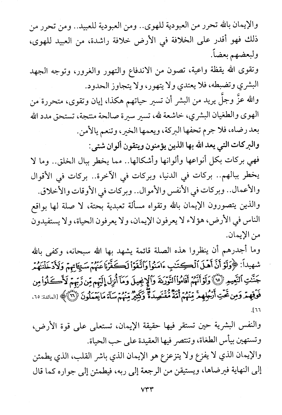 والله عزَّ وجلَّ يريد من البشر أن تسير حياتهم هكذا، إيان وتقوى، متحررة من الهوى والطغيان البشري، خاشعة لله، تسير سيرة صالحة منتجة، تستحق مدد الله بعد رضاه، فلا جرم تحفها البركة، ويعمها الخير، وتنعم يالأمن.